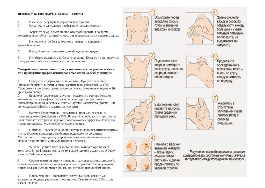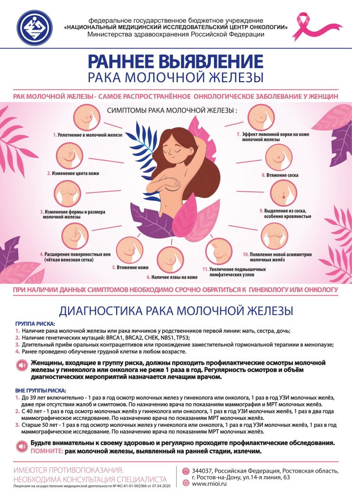 Регулярно, каждый месяц после менструации, проводите самостоятельный осмотр груди. Обратите внимание на следующие признаки, которые могут потребовать консультации врача: